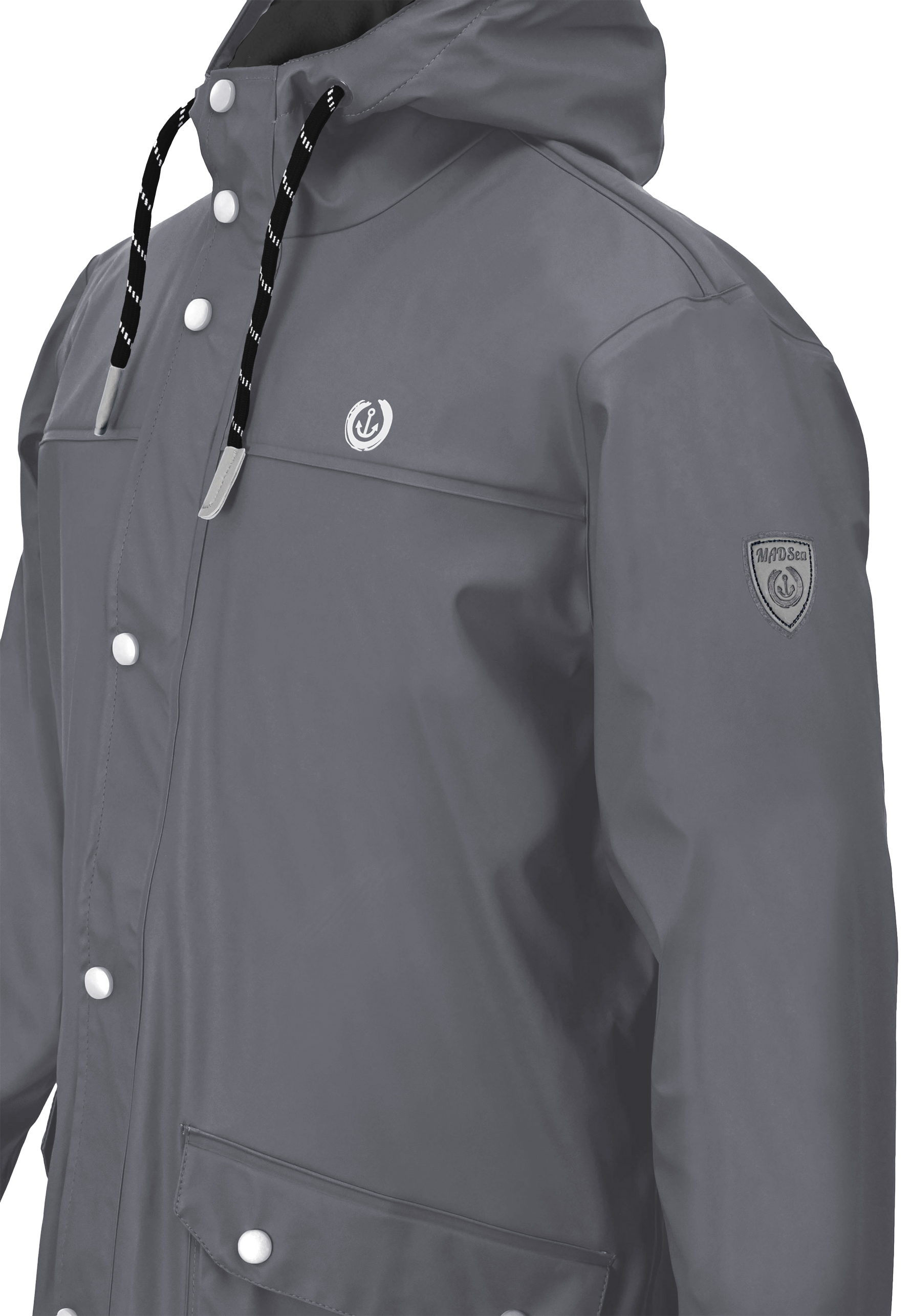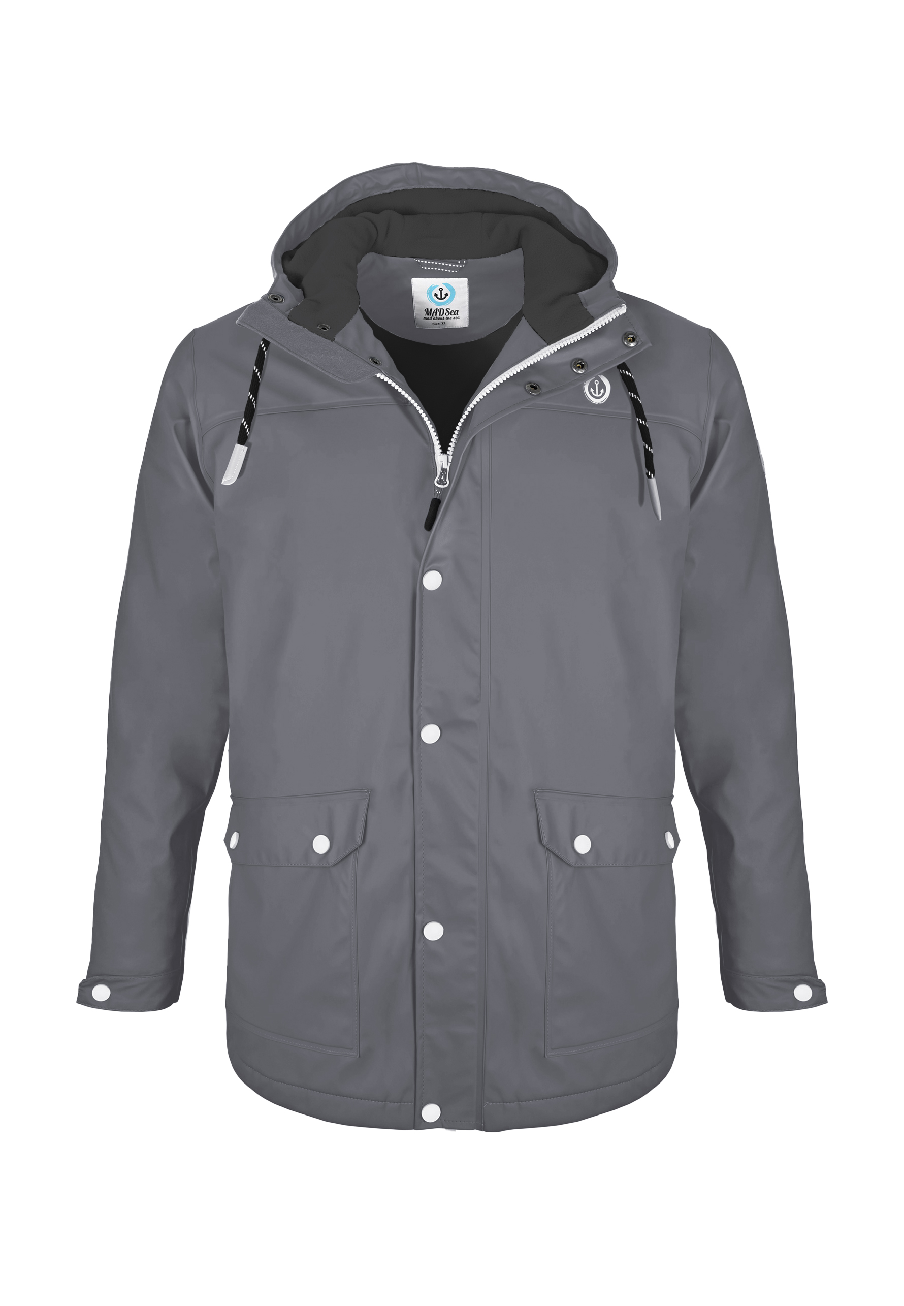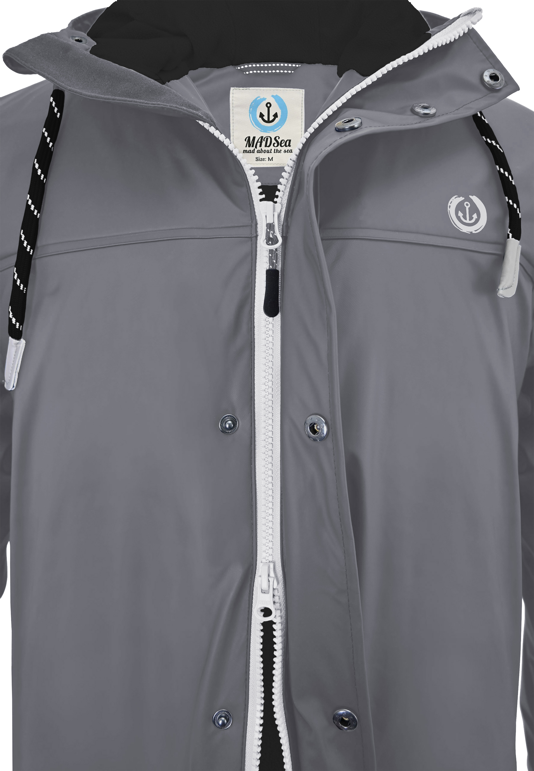 - MADSea Regenjacke in dunkelgrau mit wärmendem High-Tech Fleece, mehrfach verstellbarer Kapuze und verlängertem Rückenteil, wind- und wasserdicht