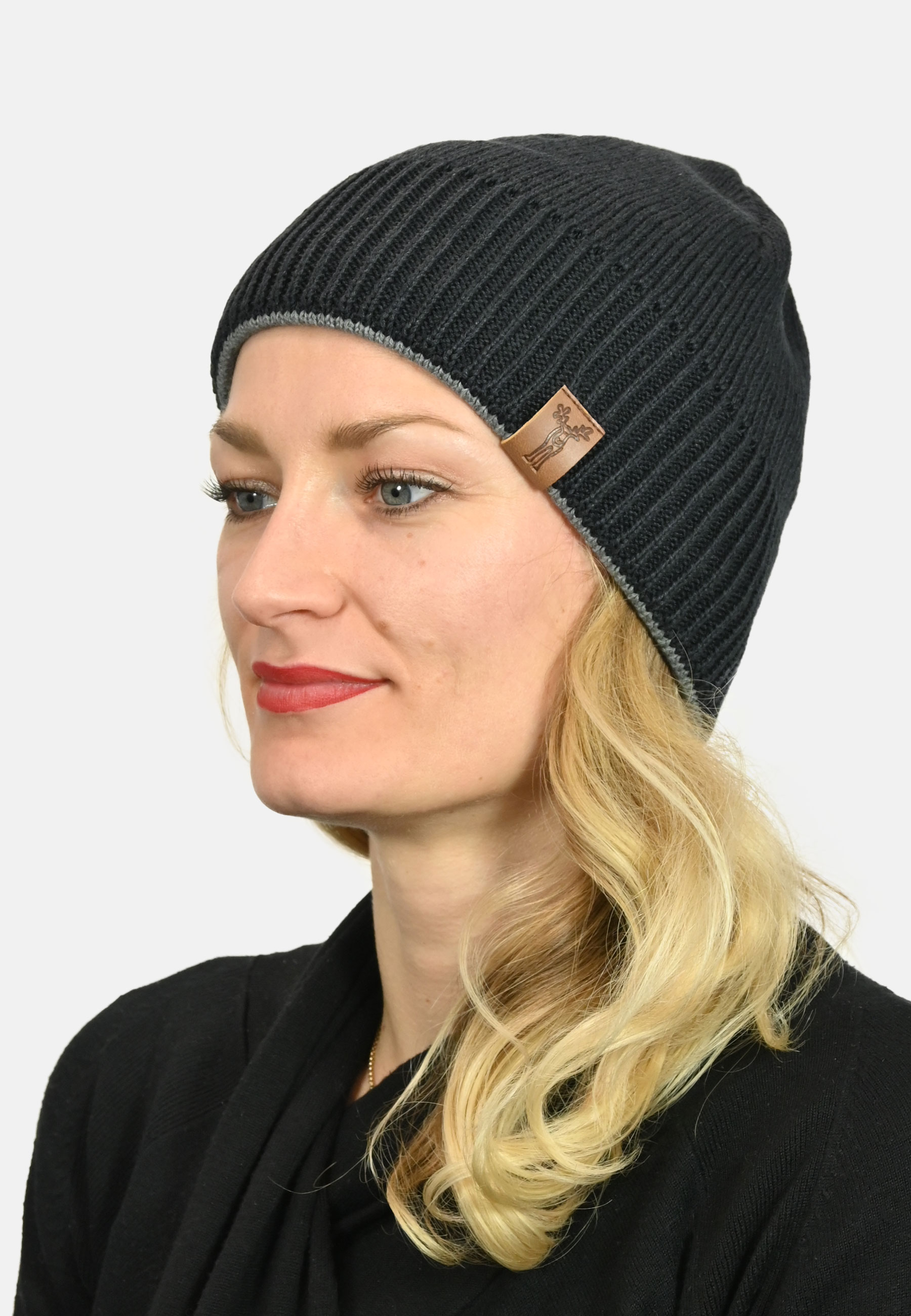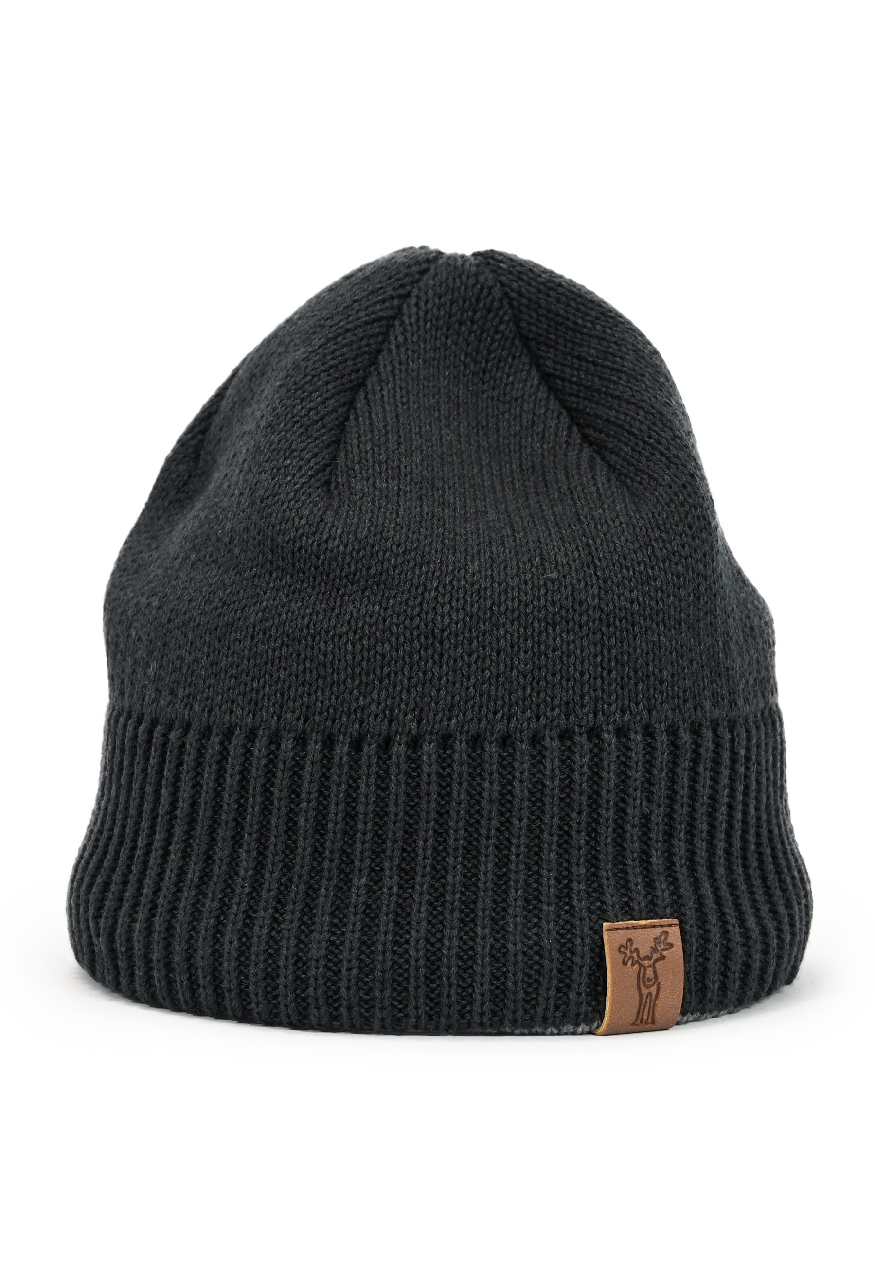 - Elkline Strickmütze mit farbigem Rand und Fleece Futter sowie Elch-Logo in Lederoptik